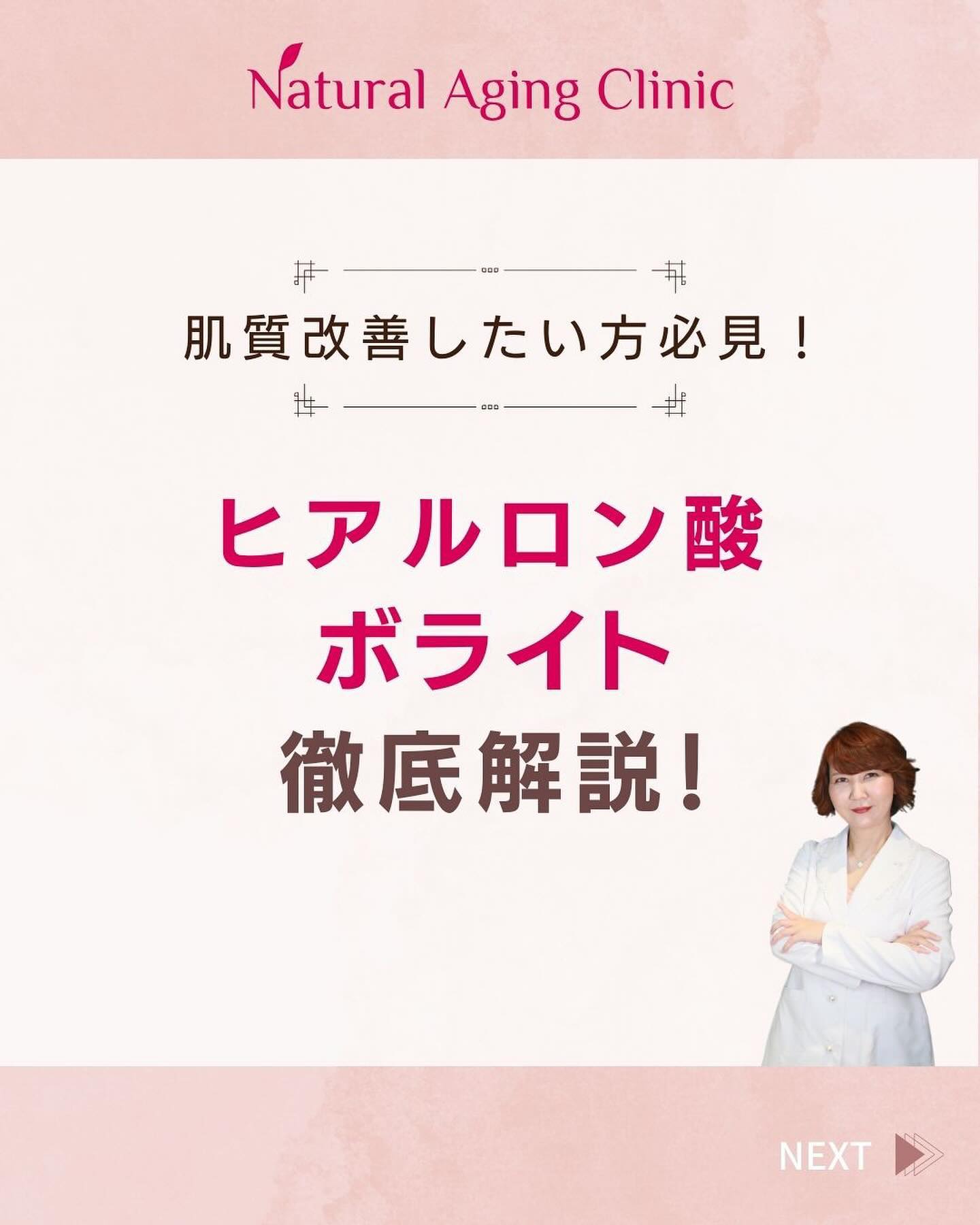 皆様こんにちは今回は3月4月キャンペーン中の、ヒアルロン酸ボライトについて解説します。肌質改善に興味のある方必見️さらに昨日からSpringキャンペーン拡大中ヒアルロン酸、ボライト、ボトックスを初めて施術される方は、なんと50%offになります🤩キャンペーン詳細はスタッフまでお問い合わせください♀️気になる方はお気軽にカウンセリングにいらしてください!———————————————宗雪正美ナチュラルエイジングクリニック院長美容皮膚科医■千葉駅から徒歩2分♀️■フォトフェイシャル症例数_2,000件以上■美容医療初心者さんに優しい医院■あなた専用「美」のかかりつけ医⚕️■丁寧なカウンセリングでオーダーメイド治療■女性医師のみ(経験豊富なスタッフ多数)🗓休診日は水曜日(10:00-18:00)043-441-3063〒260-0031千葉県千葉市中央区新千葉2丁目2-1新日本EXビル 5階———————————————フォトフェイシャルならお任せください。プロフィールのハイライトにあるLINE@から簡単に予約できます。#美容クリニック#美容医療#美容皮膚科#ニキビ跡#ダウンタイム#フラクショナルレーザー#レーザー治療#フォトフェイシャル#光フェイシャル#フォトフェイシャルm22#ステラm22#ナチュラルエイジングクリニック#naturalagingclinic#ダーマペン#医療ハイフ#ボトックス注射#ヒアルロン酸#ポテンツァ#POTENZA#脱毛#医療脱毛おすすめ#医療脱毛レーザー#医療脱毛キャンペーン#医療脱毛レポ#医療脱毛 #ハイフ#hifu#リフトアップ#肌荒れ#スキンケア