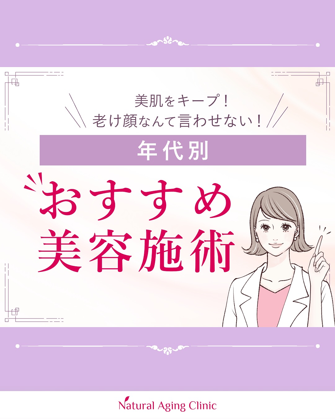 @natural.aging.clinic\年代別おすすめ美容施術をご紹介/千葉駅の美容クリニック「Natural Aging Clinic」です年代に合わせた美容施術、できていますか?20代は毛穴・ニキビに「ピーリング」30〜40代はたるみに「MWデュアルリフト」🏻♀️50代〜は補正&本格エイジングに「ヒアルロン酸」あなたに合った施術は、ナチュクリで見つけましょう!宗雪正美ナチュラルエイジングクリニック院長美容皮膚科医■千葉駅から徒歩2分♀️■フォトフェイシャル症例数_2,000件以上■美容医療初心者さんに優しい医院■あなた専用「美」のかかりつけ医⚕️■丁寧なカウンセリングでオーダーメイド治療■女性医師(経験豊富なスタッフ多数在籍)🗓休診日は水曜日・日曜日043-441-3063〒260-0031千葉県千葉市中央区新千葉2丁目2-1新日本EXビル 5階———————————————フォトフェイシャルならお任せください。プロフィールのハイライトにあるLINE@から簡単に予約できます#美容クリニック#美容医療#美容皮膚科#千葉美容クリニック#千葉駅#年代別美容#ピーリング#MWデュアルリフト#糸リフト#ヒアルロン酸#エイジングケア