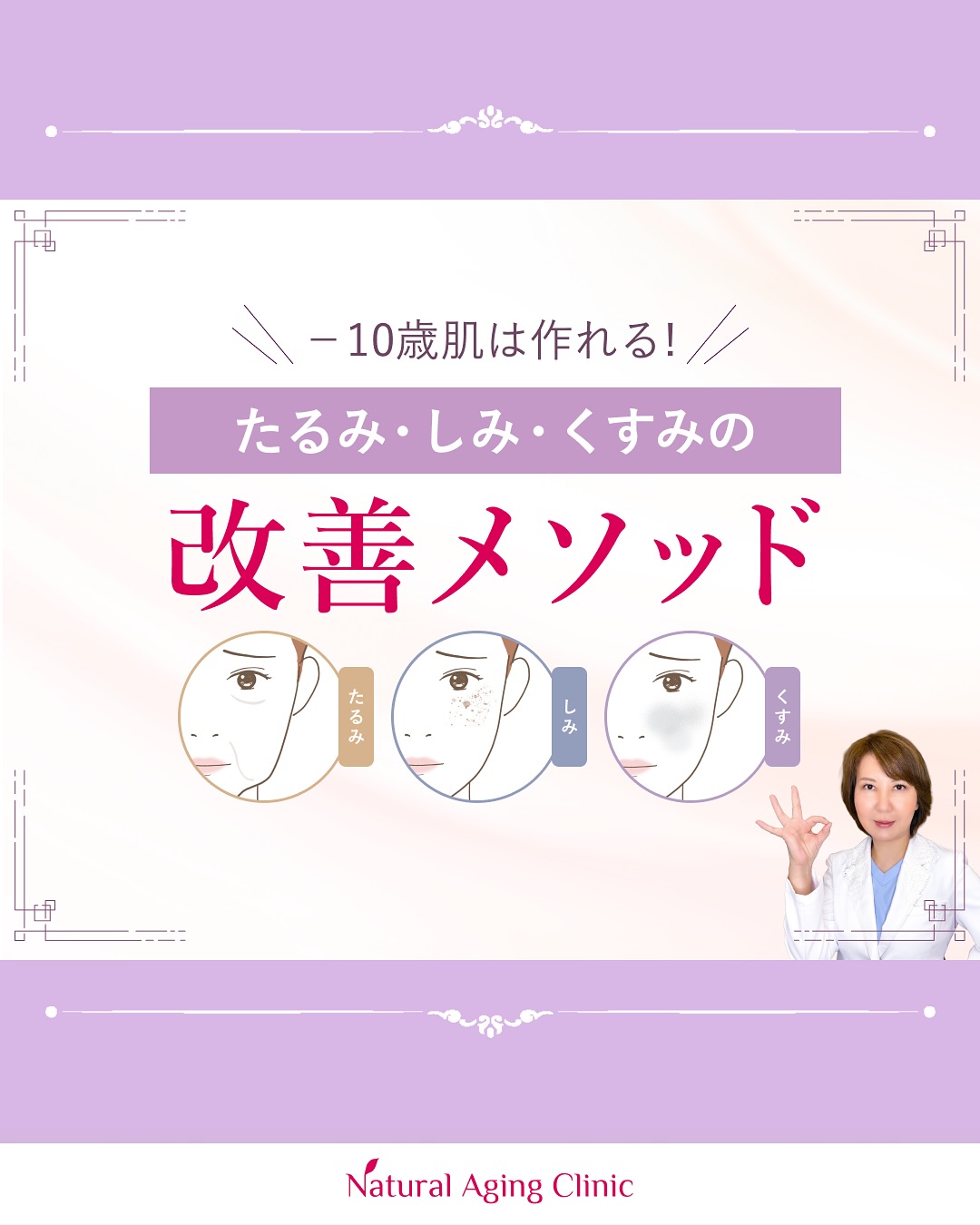 @natural.aging.clinic\医師が教える“たるみ・しみ・くすみ”改善メソッド/千葉駅の美容クリニック「Natural Aging Clinic」です「最近なんだか疲れて見える」「肌にハリがなくなってきた…」そんなお悩みの原因は、“たるみ・しみ・くすみ”にあるかもしれません…。今回はそれぞれの特徴と原因、おすすめの施術をご紹介します🏻‍♀️それぞれを組み合わせることで、より若々しい印象が叶います🪄「−10歳見え」を目指す方は、ぜひ一度ご相談ください宗雪正美ナチュラルエイジングクリニック院長美容皮膚科医■千葉駅から徒歩2分‍♀️■フォトフェイシャル症例数_2,000件以上■美容医療初心者さんに優しい医院■あなた専用「美」のかかりつけ医‍⚕️■丁寧なカウンセリングでオーダーメイド治療■女性医師(経験豊富なスタッフ多数在籍)🗓休診日は水曜日・日曜日043-441-3063〒260-0031千葉県千葉市中央区新千葉2丁目2-1新日本EXビル 5階———————————————フォトフェイシャルならお任せください。プロフィールのハイライトにあるLINE@から簡単に予約できます#美容クリニック#美容医療#美容皮膚科#千葉美容クリニック#千葉駅#たるみ#しみ#くすみ#MWデュアルリフト#糸リフト#フォトフェイシャル#Qルビーレーザー#ピーリング